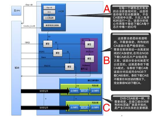 NGB下載CA的密鑰及派生算法均與加密機及前端CA服務器分離,即使有黑盒的NGB下載CA,黑盒保護的是與機頂盒有關的根密鑰,這個根密鑰與每一臺合法的芯片邦定,其作用與每一臺終端唯一的ID號等同,也與互聯網安全保護的CA證書作用類似,而用于CW加密的算法是標準和開放的,這個算法在終端中的使用頻次很低。因此,不論NGB下載CA還是泰信下載 CA,都不需要再像以往的CA那樣在前端機房設置一個高度封閉的用于加密CW的加密機,可以不需要在運營商前端下載CA服務器設置黑盒。