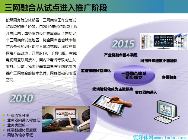很多從業者認為,我在網上也看到一些文章,說三網融合是吹出來的,但確確實實是吹出來的,不是靠總結報告寫出來的。首先我們看一下,54個城市實實在在開展了,2010年的時候當時12個城市,當時連報告都不知道怎么寫,并且還要催。但是現在很多非試點的城市已經開了,這些資料都是網上公開的,大家都可以在網上直接找到這些資料。