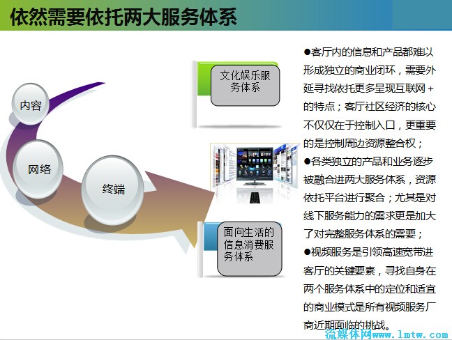 在三網融合后,廣電和電信運營商面臨的壓力會越來越大,傳統業務都是守不住的,包括IPTV,雖然今天得到發展,但是如果IPTV業務模式不變,商業模式不變,幾年以后也會被替代。那么守不住的情況下就要改變策略,以用戶為中心,重新從數字化和生活服務兩個方面設計,這三點就是大家選業務和設計業務體系過程當中,給大家的參考,謝謝大家!