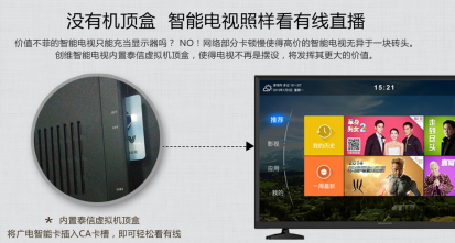電視像手機一樣是離人們日常生活中最近的終端,也是家庭客廳必備。但是現在用戶家中的智能電視僅充當一臺顯示器,若想要發揮它的大屏功能,就必須外接一臺廣電機頂盒或者網絡機頂盒。這樣對于用戶來說除了有額外的費用以外,還有亂七八糟的接線,既影響美觀,又讓人眼花繚亂,每次看不同的節目內容就要插拔線,太麻煩了!