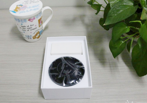 主機為黑色塑料材質,飛碟造型,頂面為鋼琴烤漆,中央圓環區為紅外學習接收窗口。
