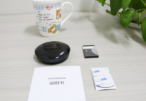 泰信智能溫控器包裝簡約穩妥,造型小巧精致,黑色塑料鋼琴烤漆,標配一塊1500 mAh的鋰電池,附贈固定用的3M膠貼。