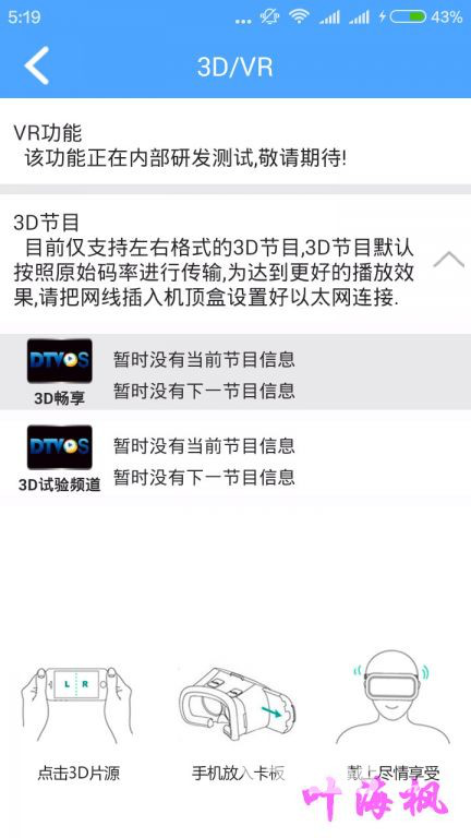 3D功能指的是有線電視中已經開播的3D頻道,而VR是目前較火的娛樂項目,用戶在這里可以通過VR眼鏡近距離大屏體驗3D節目或有線直播,此功能目前還在進一步完善中。(即將推出)