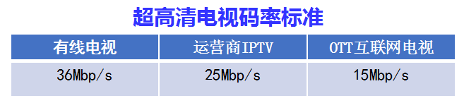 要高質量傳輸超高清電視、保證良好的用戶體驗,超高清視頻的傳輸必須保障峰值帶寬。目前能夠比較低成本傳輸4K超高清的是有線電視DVB C網絡。DVB C普遍使用單信道64QAM調制,最高只能傳輸38M的碼流,所以有線電視的超高清節目碼率被定義在了36M。