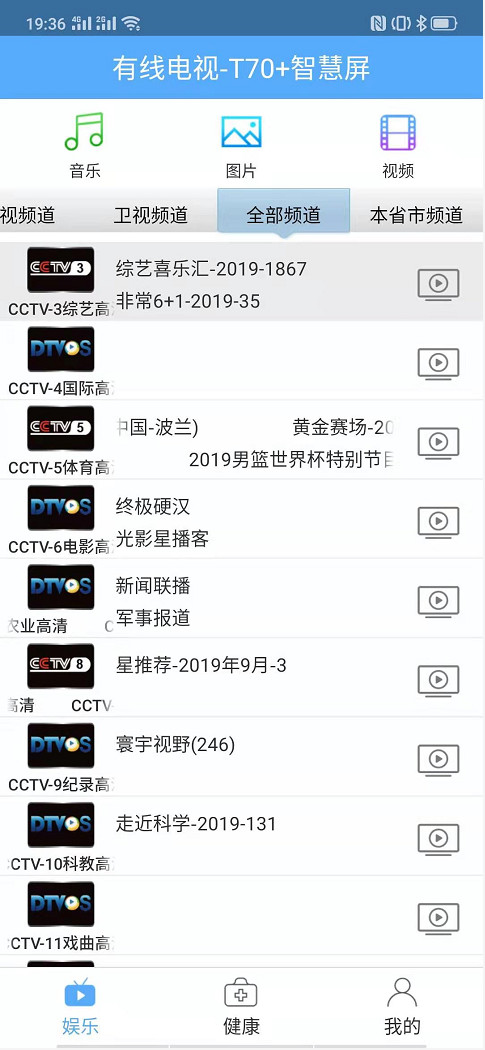 這是手機(jī)切換T70直播頻道的操作界面。在看電視的時候,可在手機(jī)上查看電子節(jié)目指南(EPG)信息,并選擇要看的直播頻道。