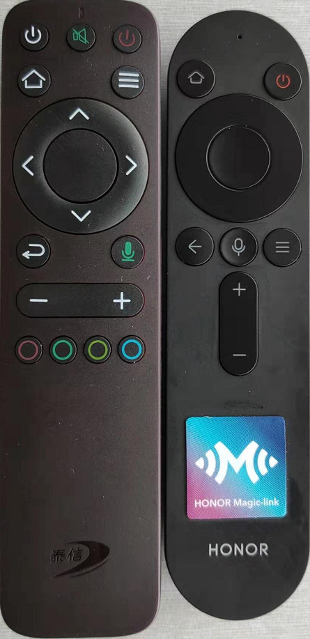 T70的遙控器和智慧屏遙控器差不多大。T70遙控器也是一個學(xué)習(xí)型紅外線遙控器,整個外殼是深紫紅色半透明,用于透射紅外線,可見其成本是很高的。T70遙控器白色的電源開關(guān)鍵用于遙控電視機(jī)電源,紅色的用于T70電源遙控,還有4個多功能顏色鍵。藍(lán)色的是藍(lán)牙/電視切換鍵,按一下進(jìn)入藍(lán)牙音箱,再按一下進(jìn)入電視模式。 智慧屏的藍(lán)牙遙控器延續(xù)了互聯(lián)網(wǎng)電視簡潔的風(fēng)格。兩種藍(lán)牙語音識別率都比較高,操控比較順暢。