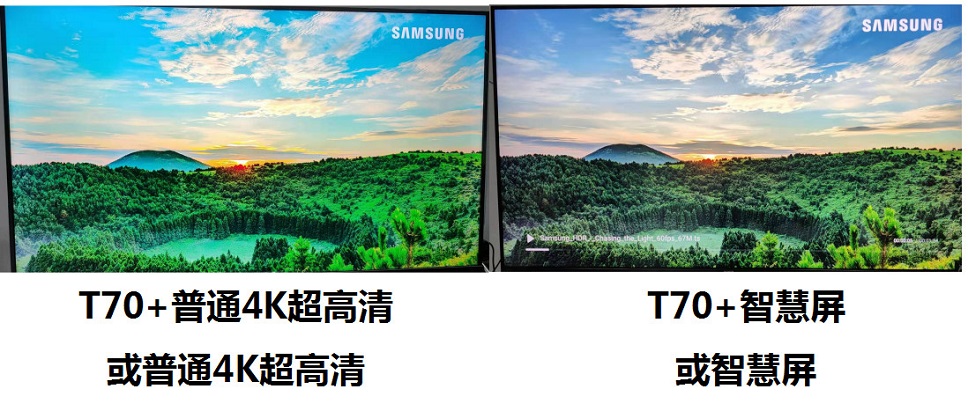使用T70、普通4K超高清電視和智慧屏分別播放一段三星67Mbps的4K超高清視頻。這段視頻是HDR1000格式(專業(yè)、愛好者級別的HDR),10bit、H.265壓縮,是目前能找到的碼流速度最高的4K超高清信號源,在同一時刻手機(jī)拍照: