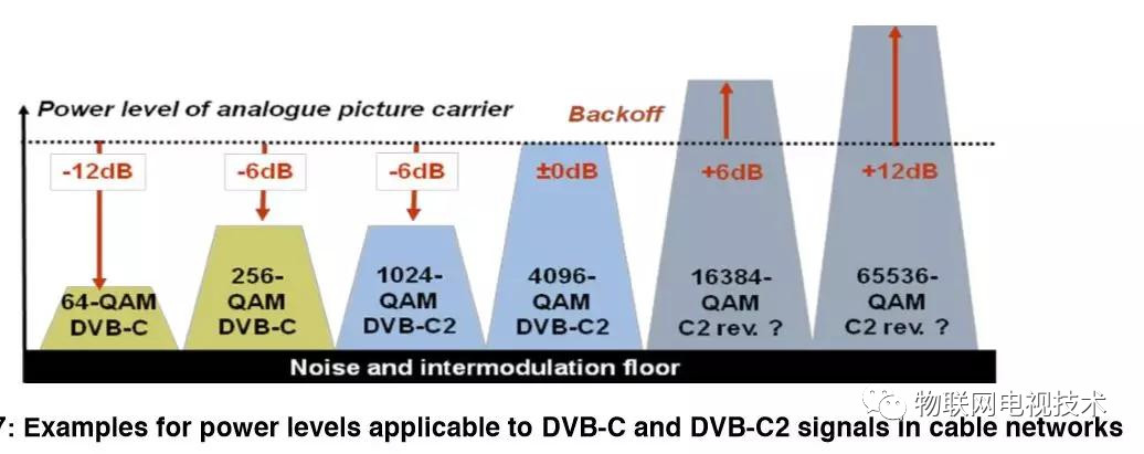 從該圖可以看出,現在普遍使用的DVB C 64QAM僅僅處于起始階段,結合香農第二定律比較容易理解該圖的意義:通過提高信號功率,采用更高階的QAM調制,有線電視仍大有潛力可挖。