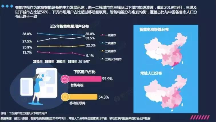 說出來你可能不信,幾乎人手一部的手機居然在下沉市場的“廝殺”中,輸給了智能電視。根據(jù)《報告》數(shù)據(jù)顯示,智能電視下沉用戶占比已達到55.9%,超出移動互聯(lián)網(wǎng)1.6個百分點。其實,智能電視作為家庭智能設備的主力,同時也是客廳經(jīng)濟的核心,始終是一個家庭不能或缺的存在。80年代,因經(jīng)濟條件限制,昂貴的“冰箱、電視、洗衣機”成為結(jié)婚必須的“三大件”,此時電視尚未大規(guī)模走入千家萬戶。但伴隨社會環(huán)境的變化以及科技的發(fā)展,電視的科技成分日漸高漲同時價格也日益低廉,這使得下沉市場智能電視用戶占比較2015年高出7.4個百分點,增速明顯。