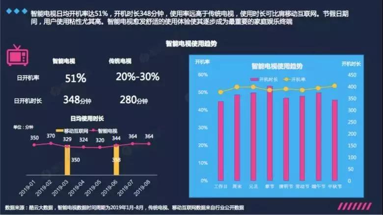 近年來,關(guān)于電視的唱衰之聲不絕于耳,論調(diào)集中在電視開機率低,買來只做客廳裝飾品上。但事實可能讓這些“唱衰者”失望了。目前,智能電視的日開機率達到51%,日開機時間達到348分鐘,使用時長遠高于傳統(tǒng)電視。同時,從日均使用時長上來看,智能電視在與手機的“比拼”中,也不落下風。在對智能電視使用趨勢的研究中,酷云互動還發(fā)現(xiàn),每逢節(jié)假日,智能電視開機率及開機時長便雙雙增長,這也從側(cè)面反映了當前中國社會普遍出現(xiàn)的“宅經(jīng)濟”、“懶經(jīng)濟”現(xiàn)象,經(jīng)過繁忙的工作后,更多用戶選擇呆在家中看電視、享受生活。