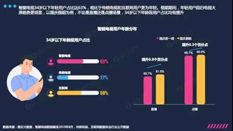 假期期間,年輕用戶回歸電視大屏趨勢更為明顯。以國慶假期為例,期間直播、點播年輕用戶皆有所增長,分別提高0.8個百分點和0.3個百分點,“70年閱兵”的隆重與盛大強勢拉動年輕用戶回歸,因為從傳播質(zhì)量、公信力以及觀看體驗方面來看,電視依然具有無法撼動的權(quán)威地位。