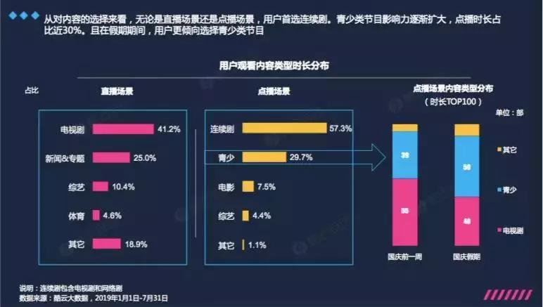 還記得每逢9月1日家里電視就被《開學第一課》支配的恐懼嗎?根據(jù)酷云EYE Grow數(shù)據(jù)顯示,2019年的《開學第一課》直播關(guān)注度達到了11.0389%,與2018年相比直播關(guān)注度增長了2.2080%。如此高關(guān)注度背后映射出的是,青少類節(jié)目已成為影視綜之外,最具增長實力的節(jié)目類型。《報告》顯示,目前在點播場景下青少節(jié)目排名僅次連續(xù)劇,占比近30%,且假期期間用戶更傾向選擇青少類節(jié)目。究其原因,酷云互動認為,非假日期間家長為安撫年幼的孩童,更樂于點播青少類節(jié)目,以此使孩子安靜下來,降低其在家中的“破壞性”。假期期間,父母會將電視選擇權(quán)交給孩子,讓他們點播自己喜愛的青少類節(jié)目。因此,青少類節(jié)目正成為繼影視綜外,觀眾觀看需求增長迅速的節(jié)目類型。