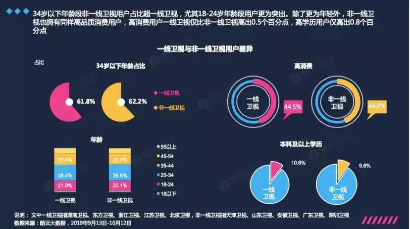 答案是肯定的。從用戶年齡上看,非一線衛(wèi)視用戶年輕化程度甚至超越一線衛(wèi)視,34歲以下用戶占比達到62.2%,超出一線衛(wèi)視0.4個百分點。從消費能力上看,非一線衛(wèi)視也不乏高消費用戶群體,9.8%高學歷用戶占比及44%的高消費人群占比,使非一線衛(wèi)視同樣能夠滿足廣告主的投放需求,實現(xiàn)目標人群的精準覆蓋。