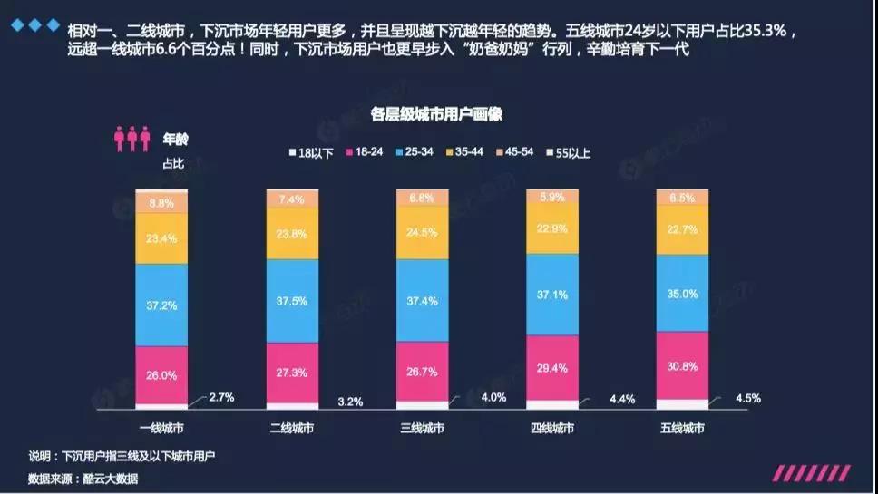 提起北京、上海、深圳這些大城市,人們的固有印象大多是在外打拼的年輕人格外多。但事實果然如此嗎?《報告》數(shù)據(jù)顯示,相對一、二線城市,其實下沉市場的年輕用戶反而更多,且呈現(xiàn)出越下沉越年輕的趨勢。也就是說,我們認知中下沉市場年輕人缺失、老人與孩童留守的印象其實并不正確。