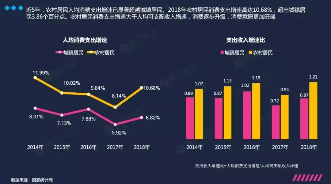 較小的生存成本與壓力、舒適的生活節(jié)奏,都使下沉市場用戶能更為放心大膽的進行消費,因而目前農(nóng)村居民消費支出增速已大于人均可支配收入增速,而且旺盛的消費需求也在促使其消費升級。