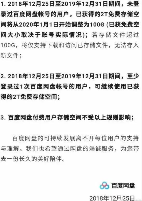 但不得不給你潑盆涼水:隨著網(wǎng)易云盤的關(guān)閉,免費(fèi)的網(wǎng)盤就剩百度云盤一家了,而且從明年1月1號開始縮減免費(fèi)使用空間。原因是網(wǎng)盤服務(wù)的成本很高,大量的服務(wù)器耗電、寬帶成本支出讓百度網(wǎng)盤每年虧損20億!