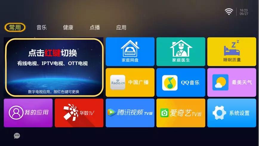 比較大的窗口留給直播電視,你可以選擇有線電視、IPTV、OTT等廣電總局批準的直播APP電視服務,其它的窗口可以是家庭網盤、視頻點播、智能家居物聯網應用等應用。